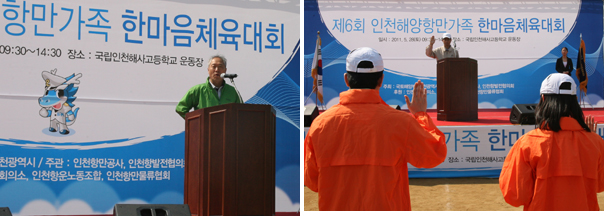 인천항만공사(IPA, 사장 김종태 우측사진: 선수로부터 선서를 받고있다)와 인천항발전협의회(회장 이귀복 좌측 사진)는 28일 9시 30분부터 오후 3시까지 인천시 중구 북성동 소재 인천해사고등학교 운동장에서 열린 제16회 바다의 날 기념 ‘제6회 인천항만가족 한마음 체육대회’를 성황리에 종료했다.