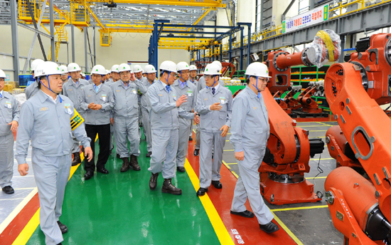 (사진:현대중공업 김정래 경영지원본부장(오른쪽에서 첫번째), 강창준 해양사업본부장(오른쪽에서 두번째) , 권오신 엔진기계사업본부장(오른쪽에서 세번째)이 울산 본사 내 로봇 신공장을 둘러보고 있다)