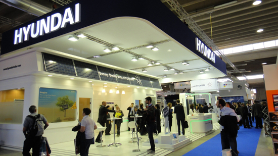 이번 전시회에는 2,200개 업체가 참가하고 7만 5천명 이상이 방문할 것으로 예상되는 가운데, 현대중공업은 폴리실리콘과 잉곳, 웨이퍼, 태양전지, 모듈, 태양광 인버터 등 태양광 일관생산 전 품목을 비롯해 올해 양산에 들어갈 국내 최고 19.2% 고효율 태양전지 및 발전단지 대형화에 맞춰 개발한 500kW급 대형 인버터도 최초로 공개할 예정이다.(사진:현대중공업이 지난 5월 초 이태리에서 참가한 ‘솔라엑스포’ 태양광 전시회)