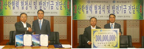 한국해양대학교(총장 오거돈)는 동남정공(주)(대표이사 탁태식)와 9일 오전 11시 30분 대학 본부 3층 회의실에서 「산학협정식 및 대학발전기금 전달식」을 가졌다.