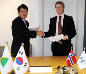 (사진:현대중공업 강영석 오슬로 지사장(사진 오른쪽)과 회그LNG사 사업 총책임자 베가르 헬레클레이브(VAGARD HELLEKLEIV)가 계약 서명 후 악수하고 있다)