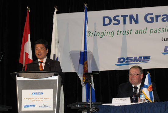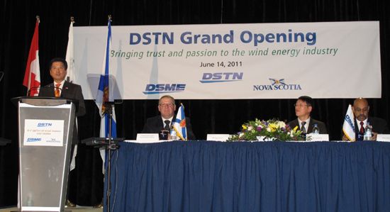 이 행사엔 대우조선해양 남상태 대표이사를 비롯해 캐나다 풍력공장 합작회사인 DSME Trenton(DSTN)의 이남기 대표, 노바 스코샤 주지사인 대럴 덱스터(Darrel Dexter)씨 등 다수의 주요 내외빈들이 참석해 현지 풍력사업에 대한 높은 기대치를 보여줬다.(사진 : 지난 14일 (현지시간) 캐나다 트렌튼에서 열린 대우조선해양 풍력발 전설비 생산공장 준공식에 대우조선해양 남상태 대표이사 (왼쪽), 대럴 덱스터 주지사 (오른쪽) 등이 참석한 가운데 남 대표이사가 기념 축사를 하고 있다)