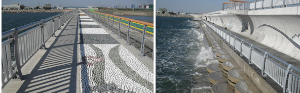 송도스포츠센터 앞에 위치한 ‘신항 바다쉼터’에는 석양을 바라볼 수 있는 낙조전망대, 바다와 함께 산책을 즐길 수 있는 지압보도, 인천항을 소개하는 타일 모자이크 등이 설치되어 있다.
