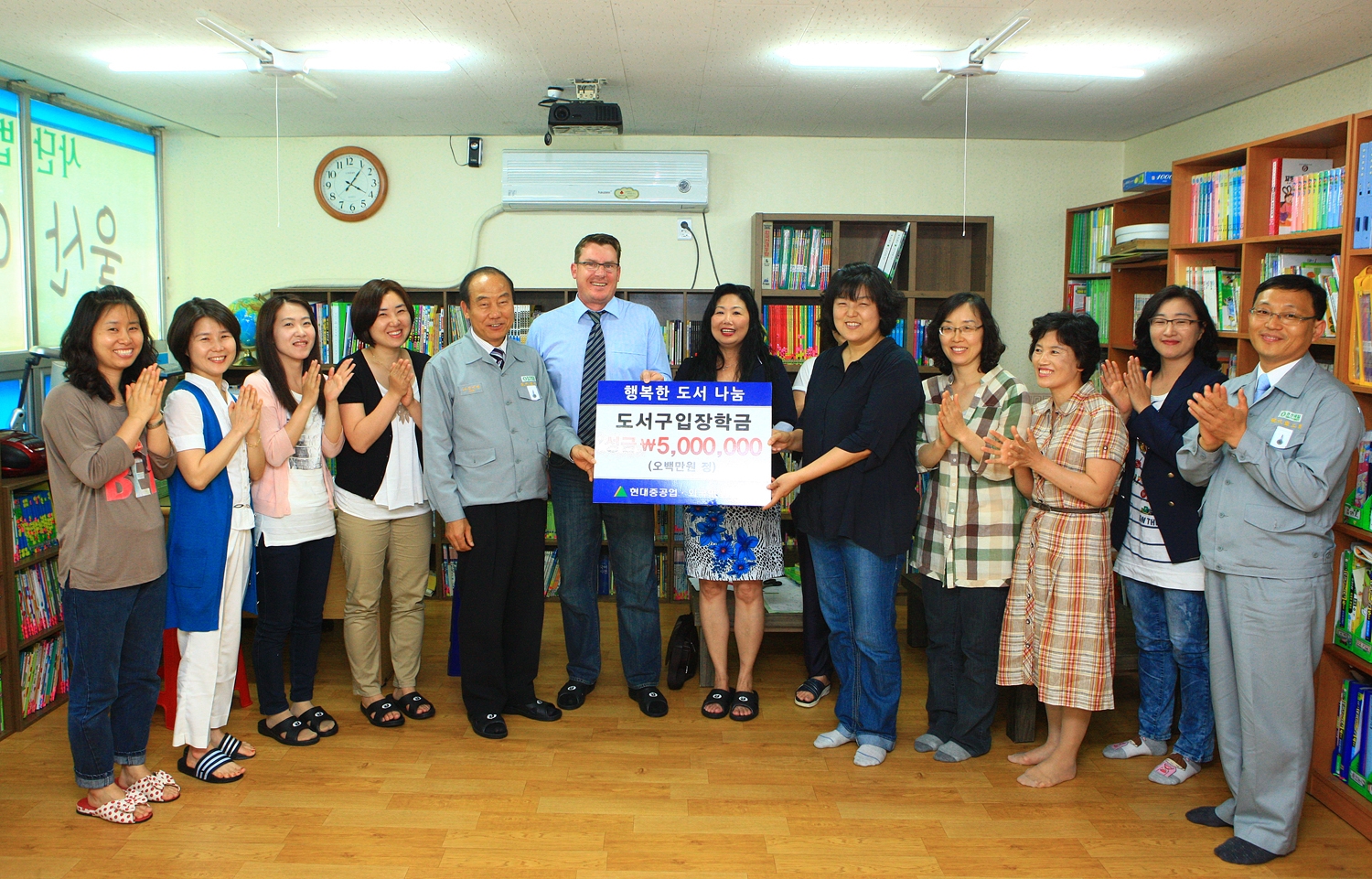사진설명: 현대중공업 외국인 감독관 줄리안 스미스 씨(Mr.Julian Smith, 호주/왼쪽에서 여섯번째)가 울산 지역 아동센터인 '자람터'에서 후원금 증서를 전달하고 있다.
