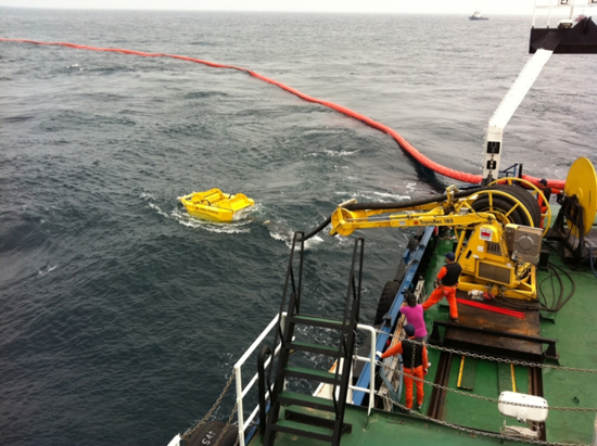 해양환경관리공단은 수심 98m에서의 특수 수중작업을 위해 세계적인 구난회사인 스미트(SMIT)사를 작업 수행업체로 선정했다. 이 회사의 해상작업기지선(SMIT BORNEO호, 7323톤)은 지난 16일 포항에 도착했으며, 회수작업은 6월 20일 작업해역에 해상작업기지선을 고정하는 것을 시작으로 7월 중 완료될 예정이다. (사진:해양환경관리공단의 환경5호가 20일부터 시작된 경신호 잔존유 회수작업을 위해 포항 앞바다에서 방제작업 중이다)