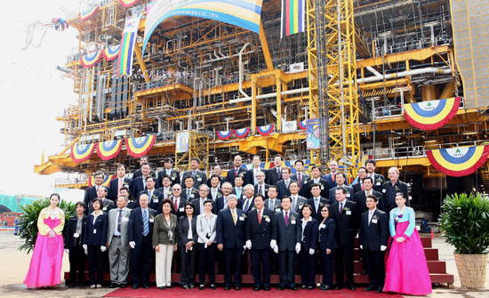 현대중공업은 지난 7일(목) 오후 울산 본사 해양 안벽에서 태국 PTTEP(PTT Exploration and Production Public Company Limited)사의 봉콧(Bongkot) 가스 가압(加壓),정제 플랫폼에 대한 출항식을 가졌다고 밝혔다. (사진:지난 7일(목) 현대중공업에서 태국 봉콧 설비 출항식이 열렸다. PTTEP사 수라퐁 이암출라 부사장(왼쪽 9번째), 차이용 삿지파논 주한 태국대사(왼쪽 10번째), 강창준 현대중공업 해양사업본부장(왼쪽 11번째)