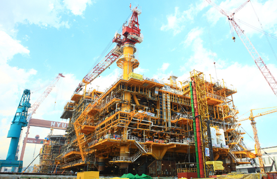 현대중공업이 제작한 3만톤 규모의 대형 해양 플랫폼이 위용을 드러냈다.