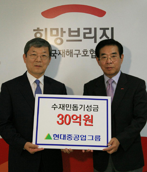 현대중공업그룹은 31일(일) 이재성 현대중공업 사장이 희망브리지 전국재해구호협회를 방문, 최근 집중호우로 큰 어려움을 겪고 있는 수재민을 위해 성금 30억원을 전달했다고 밝혔다. (사진 : 이재성 현대중공업 사장(사진 왼쪽)과 한중광 희망브리지 전국재해구호협회 상임이사(오른쪽)가 기념촬영을 하고 있다.)