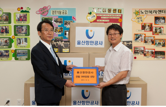 울산항만공사(UPA, 사장 이채익)는 정부의 공정한 사회 만들기에 동참하기 위하여 울산지역 사회적 기업인 (사)한국소비생활연구원 울산광역시지부 나누리사업단에서 생산한 양말 700 SET을 구매했다.(사진:UPA 이상용 경영기획 본부장(우)이 울산중구노인복지센터 문현진 센터장에게 400만원 상당의 양말을 전달하고 있다)
