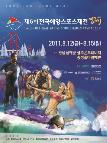 국토해양부(장관 권도엽)는 국토해양부가 주최하고 남해군이 주관하는 제6회 전국해양스포츠제전이 “꿈을 안고 남해로! 바다를 품고 세계로!” 라는 주제로 8월 12일부터 15일까지 나흘간 남해 상주은모래비치와 송정솔바람해변에서 열린다고 밝혔다.