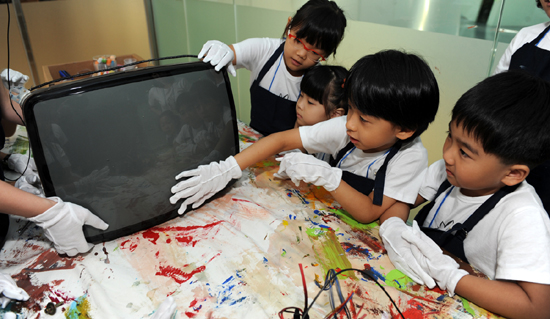 특히 이번 행사에는 최은영 회장이 직접 참석해 직원 자녀들과 식사 등을 같이 하며 즐거운 시간을 함께 했다. 행사에 참가한 수입판매팀 김현구 차장의 딸인 김소은(9살)양은 “이번 방학기간 동안 아빠와 함께 미술관에 와서 만들기를 한 것이 제일 기쁘다”며, “백남준 아저씨 같은 훌륭한 사람이 될 수 있도록 열심히 공부하겠다”고 소감을 밝혔다.(사진:임직원자녀들이 TV 만들기 체험을 하고 있다)