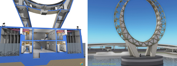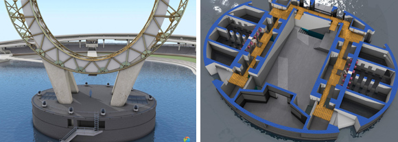 2012여수세계박람회 조직위원회(위원장 강동석, 이하 조직위)는 디오 구조물을 일반적인 임시물막이 공법이 아닌 강철봉 및 유압잭에 의한 해상 중량물 가설 공법(Heavy Lifting)으로 제작해 바다 위 ‘Big-O(빅오)’ 공간에 안착시켰다고 22일(월) 밝혔다.(사진 : The O 이미지, 하부 포디엄 설치 전후)