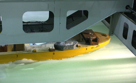 현대중공업은 최근 캐나다 「IOT(Institute for Ocean Technology) 연구센터 빙수조(Ice Tank)」에서 19만톤급 쇄빙 철광석운반선에 대한 최종 선형 성능 검증을 성공적으로 마쳤다고 24일(수) 밝혔다.(사진: 캐나다 「IOT연구센터 빙수조(Ice Tank)」에서 가진 현대중공업 쇄빙상선 선형의 최종 성능 테스트 모습)