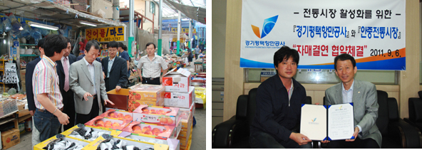 (사진: 우측=경기평택항만공사는 6일 안중전통시장 상인회에서 전통시장 활성화를 위한 양 기관의 자매결연 협약체결식을 가졌다. 박종갑 경기평택항만공사 경영관리본부장(오른쪽), 서정희 안중전통시장 상인회장(왼쪽). 좌측=경기평택항만공사 박종갑 경영관리본부장이 추석을 맞아 안중전통시장을 찾아 온누리 상품권으로 물건을 직접 구매하고 시장 상인들의 애로사항을 경청하고 있다)