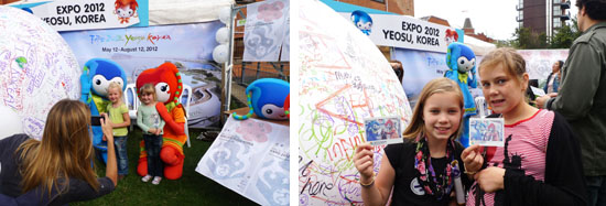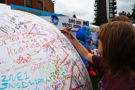 방문객들은 잔디 위에 놓인 대형 풍선에 2012여수세계박람회의 성공을 기원하는 메시지를 적고, 박람회 마스코트인 여니,수니 캐릭터 인형을 직접 착용하며 기념 촬영을 했다. 물방울과 플랑크톤을 형상화한 여니‧수니 캐릭터는 특히 어린이 관람객들에게 호응을 얻었다. (사진:△ 지난 9월10일부터 11일까지 영국 런던 템즈강 주변에서 열린 템즈페스티벌에서 2012여수세계박람회 마스코트 여니(Yeony), 수니(Suny)와 메시지 풍선이 큰 인기를 끌었다. 템즈페스티벌은 100만명 이상이 모이는 영국 최대 거리 축제로 매년 늦여름 개최된다.)