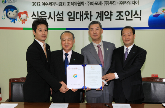 2012여수세계박람회 조직위원회(위원장 강동석)는 (주)아모제 및 공동컨소시엄사를 내년 여수세계박람회의 식음 시설 주관 사업체로 선정하고, 23일(금) 식음시설 임대차계약 조인식을 가졌다. 이들 업체는 내년 5월12일부터 8월12일까지 개최되는 여수세계박람회 기간 동안 800만 관람객의 식사를 책임지게 된다. 주 전시관인 국제관과 주제관 등에 각종 레스토랑, 푸드코트, 카페 등 총 41개의 식음시설을 운영하게 된다. (사진:왼쪽부터 23일 조직위 사무국 2층 상황실에서 열린 조인식에 참석한 (주)타워차이 김준혁 사장, 2012여수세계박람회 강동석 조직위원장, (주)아모제 신희호 대표이사, (주)우딘 정운영 대표이사)