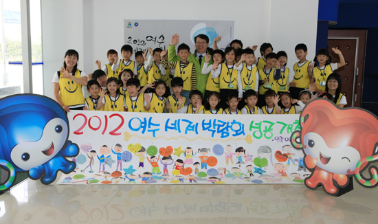 o---여수 연꽃 어린이집 어린이들이 여수세계박람회 성공 기원 그림과 메시지를 직접 그려 여수엑스포 홍보관에 전달했다. 9월26일(월) 홍보관 영상실 앞에서 36명의 일곱 살 어린이들과 2012여수세계박람회 조직위원회 김근수 사무총장(가운데)이 기념사진을 찍고 있다.