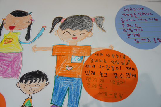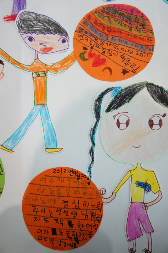 o---여수 연꽃 어린이집 어린이 36명이 직접 그린 그림 속에 여수세계박람회에 대한 기대와 희망을 담았다. 박서영 어린이(7세)는 “세게(세계)박람회를 준비하는 선생님! 세게 사람들이 재미있게 놀고 갈 수 있게 멋지게 만들어 주세요”라고 적었다.