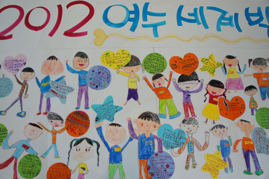 o---여수 연꽃 어린이집 어린이들이 여수세계박람회 성공 기원 그림과 메시지를 직접 그려 여수엑스포 홍보관에 전달했다. 9월26일(월) 홍보관 영상실 앞에서 36명의 일곱 살 어린이들이 그림과 함께 포즈를 취하고 있다. 박서영 어린이(7세)는 “세게(세계)박람회를 준비하는 선생님! 세게 사람들이 재미있게 놀고 갈 수 있게 멋지게 만들어 주세요”라고 적었다.