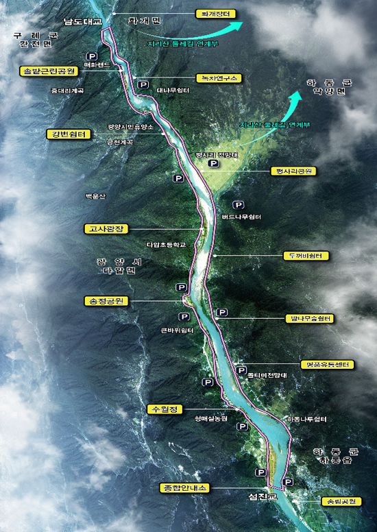 벚꽃과 매화꽃의 아름다운 풍광과 오염되지 않은 청정하천의 원형을 보전하고 있으며, 소설 ‘토지’ 등 국문학의 배경지로 익숙한 섬진강변에 스토리가 있는 100리 테마길이 조성되어 우리들에게 또다른 즐거움을 선사할 예정이다.