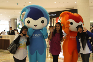 (사진:2012여수세계박람회 조직위원회(위원장 강동석)는 인도네시아 주재 한국대사관에서 개최하는 한국문화행사 기간 동안(9.28 ~ 10.4) 여니수니 사진찍기 이벤트로 여수세계박람회를 알렸다.히잡을 두른 무슬림 소녀들이 귀여운 포즈로 여니, 수니와 함께 사진을 찍고 있다)