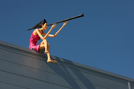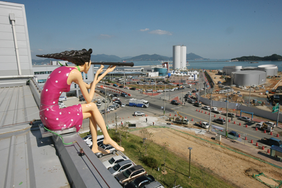 2012여수세계박람회 조직위원회(위원장 강동석)는 김경민 작가의 작품 ‘꿈꾸는 세상’을 무상 임대해 조직위 사무국 옥상에 설치했다고 4일(화) 밝혔다. 발랄한 핑크색 원피스를 입고 망원경을 통해 박람회장을 바라보는 롱다리 여자의 모습이다.