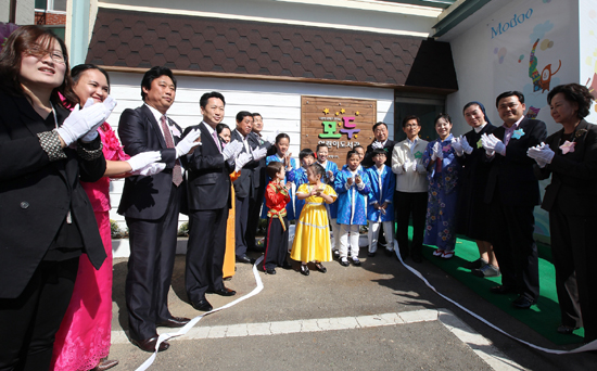(사진:다문화도서관 ‘모두’ 안산점 개관식에서 이희범 STX중공업∙STX건설 회장(맨 뒷줄 오른쪽에서 세번째), 김철민 안산시장(맨 뒷줄 오른쪽에서 다섯번째), 김문수 경기도 지사(맨 뒷줄 오른쪽에서 여섯번째), 등 주요 외빈 및 관계자들이 아이들과 함께하는 모습)