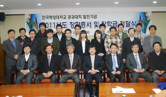 범한산업(주) 정영식 대표이사(사진 왼쪽)가 지난 11월 30일 한국해양대학교(총장 오거돈)를 방문, 공과대학 학생들을 위한 장학증서 및 장학금 전달식을 가졌다. 이날 정 대표는 한국해양대에 500만원을 희사하고, 3명의 학생들에게 장학금 및 장학증서를 전달했다.