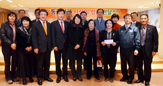 현중협의회 송정석 회장(앞줄 왼쪽에서 네 번째)과 현대중공업 자재부문 윤동원 상무(앞줄 오른쪽 두 번째)는 7일(수) 오후 한마음회관에서 열린 현중협의회의 사랑의 성금 전달식을 개최했다.