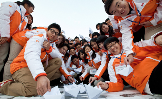 STX그룹 2012년 신입사원들이 각자 포부가 담긴 편지지로 만든 배와 함께 포즈를 취하고 있다. STX그룹은 약 5주간의 그룹연수 기간 동안 신입사원들을 대상으로 ‘One-STX’의 기본 소양을 갖춘 행동하는 지성인을 양성하는 것을 목적으로 각종 교육, 사업장 방문 및 크루즈 연수를 실시할 계획이다.
