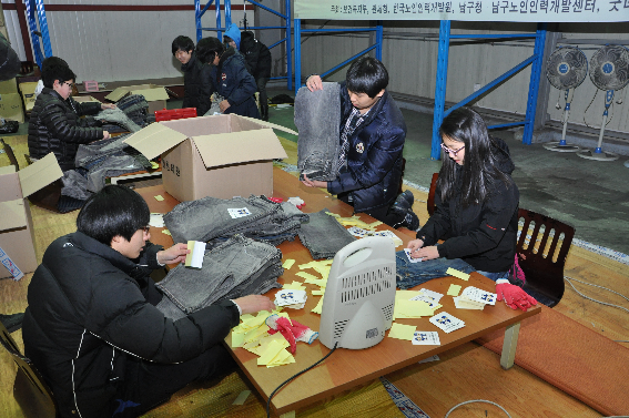 짝퉁 청바지를 후원하기 위해서는 상표를 제거하여야 하는데, 이번 행사를 위해 직원 자녀들 20여명이 겨울방학 동안 부모 직장을 체험하고 봉사활동의 일환으로 상표제거 작업(하단 사진)에 참여했다.