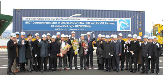 BNCT is proud to announce the start of operations at 13:00 hrs on Friday, 10 Feb. for CMA CGM with the maiden call of the RUFEX service between China, Korea and Russia by M/V MEDBOTHNIA with her vessel sharing partners, Maersk Line, OOCL, China Shipping, CSAV as well as the Busan Port Authority in attendance.