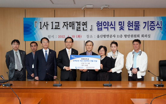 울산항만공사(UPA, 사장 박종록)는 4월 10일(화) 오후 2시 지역사회 공헌활동의 일환으로 UPA 11층 회의실에서 UPA 관계자 및 장생포 초등학교 관계자들이 참석한 가운데 ‘1사 1교 자매결연’협약을 체결하고, 교육환경 개선을 위하여 대형 PDP TV 3대와 교내 암석 학습장 설치를 위한 암석 20종 등 1,000만원에 달하는 교육용 교구를 전달했다.
