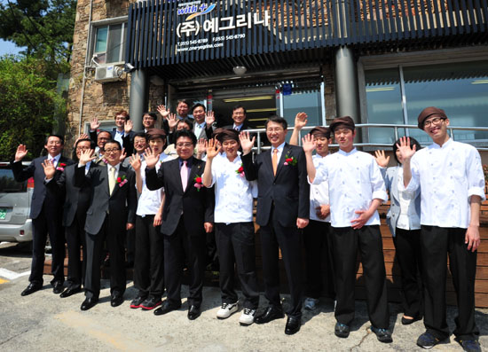 순고유말로 ‘서로 사랑하는 사이’라는 의미의 ‘예그리나’는 STX그룹이 장애인 일자리 창출을 위해 설립한 자회사형 장애인 표준사업장이다.(사진:STX가 설립한 장애인 표준사업장 ‘예그리나’가 경남 창원에서 개원식을 갖고 행사에 참석한 관계자들이 기념포즈를 취하고 있다. 사진 속 인물은 (제빵옷을 입은 직원을 제외한 오른쪽부터) 추성엽 ㈜STX사장, 이성규 한국장애인고용공단 이사장, 장윤규 STX리조트 대표이사.)