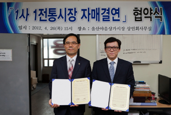 (사진:UPA 박종록 사장(좌)와 울산야음상가시장 상인회 윤홍선 회장이 협약서를 체결했다)