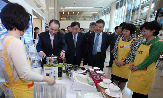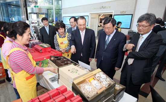STX가족봉사단이 오늘 27일 서울시 중구에 위치한 STX남산타워에서‘STX 저소득 가정 돕기 자선바자회’를 열었다. (사진:27일 STX남산타워에서 진행된 ‘STX 저소득 가정 돕기 자선바자회’에 강덕수 STX그룹 회장이 사장단과 함께 참석했다. 사진은 왼쪽부터 강덕수 STX그룹 회장, 이희범 STX중공업∙STX건설 회장, 이인성 STX조선해양 부회장.)