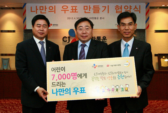 CJ대한통운(대표 이현우)은 30일 서울 중구 서소문동 본사 6층 대회의실에서 이승재 서울지방우정청 청장과 이현우 대표, 곽대석 CJ나눔재단 국장이 참석한 가운데‘나만의 우표 만들기 협약식’행사를 가졌다고 밝혔다.