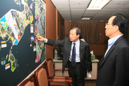 인천항만공사 김춘선 사장은 10일 박천화 인천지방경찰청 청장 일행의 예방을 받고 인천항 현황과 공사의 주요 사업들을 소개하고 갑문 등 주요 시설물을 안내했다.(사진:10일 오전 공사를 찾은 박천화 인천지방경찰청장(사진 왼쪽에서 두 번째)이 공사 대회의실에 걸린 인천항 위성사진을 보며 김춘선 인천항만공사 사장(왼쪽 첫 번째)의 설명을 듣고 있다.)