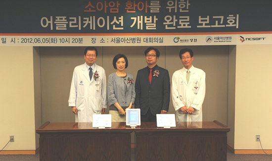 서울아산병원(원장:박성욱), 양현재단(이사장:최은영) 엔씨소프트(대표:김택진)가 공동으로 소아암 환아들이 치료에 대한 공포심을 덜고 투병 의지를 북돋을 수 있도록 돕는 아이패드용 애플리케이션(앱) ‘소아암알기: 아루미와 함께하는 소아암알기’와 치료 일정을 관리해 주는 아이폰용 어플리케이션‘소아암수첩’을 개발하여 출시한다고 5일 밝혔다. (사진:공동으로 어플리케이션 개발에 참여한 박성욱 서울아산병원장, 최은영 양현재단 이사장, 이재성 엔씨소프트 상무, 유한욱 서울아산병원 소아청소년병원장)