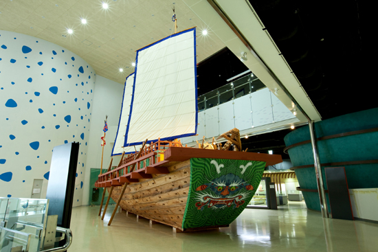 항해선박영역에는 우리나라 한선의 변천과정과 국내 최대크기로 복원(실물의 1/2크기)하는 ‘조선통신사선’이 전시된다. 조선통신사선은 조선시대에 우리나라에서 일본으로 보낸 외교사절단이 타고 갔던 선박(상단 사진)으로, 순수 국산 소나무를 사용하여 전통 조선기법으로 엄격히 복원했다.