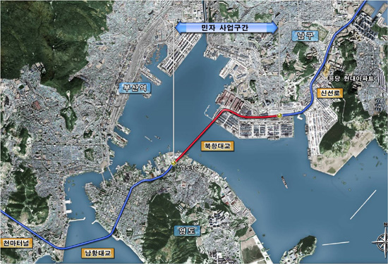 북항대교는 영도구 청학동과 남구 감만동을 연결하는 길이 3,331km(교량 1,114km, 접속도로 2,217km), 너비 18.6~25.6m(왕복 4차로) 규모의 교량이다. 총사업비는 5천384억원 규모로, 2007년 4월 건립을 시작해 2014년 4월 준공될 예정이다. 부산 신항에서 녹산․신호단지를 거쳐 명지대교, 남항대교, 광안대교 및 경부고속도로로 이어지는 항만배후도로의 일환으로, 교각 위에 세운 탑에 케이블을 경사지게 설치해 다리를 지지하는 사장교 형식으로 건설되고 있다. 특히, 국내 최장 강합성 사장교이자 국내 최초의 인공섬식 충돌방지공 등 최첨단 기술력을 바탕으로 만들어져 높은 관심을 받고 있다.(사진:위치도)