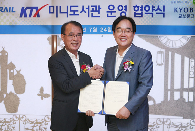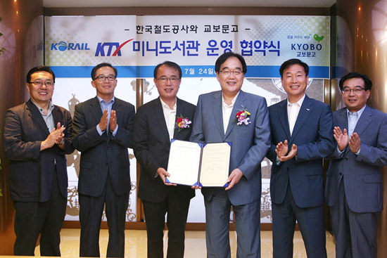 코레일은 7월 24일(화) 오전 11시, 서울 사옥에서 국내 최대 도서유통 회사인 교보문고와 ‘KTX 미니도서관’ 운영에 관한 업무협약을 맺었다.