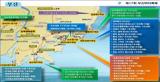 본격적인 휴가철과 함께 부산의 바다와 여름을 110% 즐길 수 있는 여름 대표 엔터테인먼트 축제 ‘제17회 부산바다축제’가 오늘부터 그 화려한 막을 연다. 8월 9일까지(9일간) 해운대를 비롯 6개 해수욕장 및 삼락생태공원, 요트경기장 등에서 ‘개막행사, 국제행사, 공연행사, 체험행사, 해양스포츠행사, 구․군 행사’ 등 6개 분야 총 42개 행사가 진행된다.