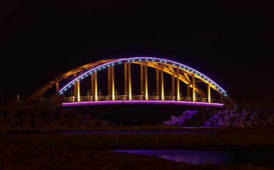 울산항만공사(UPA, 사장 박종록)는 지난 6월부터 8월까지 2개월간에 걸쳐 울산항의 야간 입․출항의 안전확보를 위한 ‘울산신항 중앙방파제 LED 설치’를 완료했다.(사진:지난 8월 울산신항 중앙방파제 교량에 설치된 LED 야간 점등 모습)