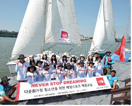 한국해양소년단연맹(총재 황규호 SK해운 대표)은 다문화 가정의 청소년들이 자신감과 용기를 심기 위해 건전한 해양스포츠활동을 통해 자신감과 용기를 얻어 사회편입에 도움을 주고자 한국청소년단체협의회가 주최하고 노스페이스가 후원하는 해양스포츠 체험교실을 지난 5일 실시했다.[사진:지난 5일 한강시민공원 거북선나루터에서 노스페이스와 한국청소년단체협의회 회원단체인 한국해양소년단연맹과 함께하는 ‘다문화가정 청소년 해양스포츠 체험교실’이 진행됐다. 체험교실에 참가한 다문화가정 청소년과 해양소년단원들이 함께 파이팅을 외치고 있는 모습.]