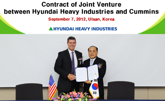 현대중공업은 지난 7일(금) 울산 본사에서 현대중공업 최병구 사장(건설장비사업본부장)과 김정환 부사장(엔진기계사업본부장) 및 커민스의 리치 프리랜드(Rich Freeland) 사장 등이 참석한 가운데, 합작법인 현대커민스엔진유한회사(Hyundai Cummins Engine Company, 이하 ‘현대커민스’) 설립을 위한 계약서명식을 가졌다고 밝혔다. (사진:현대중공업 최병구 사장(오른쪽)과 커민스의 리치 프리랜드(Rich Freeland) 사장(왼쪽)이 '현대커민스' 공장 설립 계약 서명 후 악수하고 있다.)