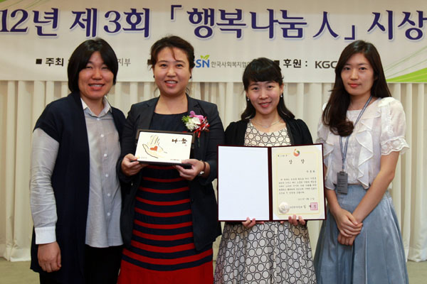 이번에 수상한 주홍회는 지역아동센터를 방문해 아동들의 현장학습을 지원하고, 무의탁 노인복지시설을 방문하는 등 정기적인 나눔활동을 실천해왔다. CJ대한통운 여직원회 ‘주홍회’가 정기적인 사회공헌활동 노력을 인정받아 보건복지부 장관상을 받았다. (사진:25일 오전 서울 광화문 코리아나호텔에서 보건복지부 주최로 열린 ‘2012년 제 3회 행복나눔인 시상식’에서 기념촬영을 하고 있는 주홍회 회장과 회원들.)