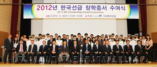 한국선급(KR, 회장 오공균)은 지난 26일, 부산 신사옥에서 2012년 장학증서 수여식과 사랑의 쌀 기증 행사를 가졌다. 이번 행사에는 찬키심(Chan Ky Sim) 주한 캄보디아 대사, 김동명 나눔재단 월드채널 상임대표, 나승수 목포대학교 공과대학장 등 관계자와 국내외 장학생, 한국선급 임직원 등 100여명이 참석한 가운데 51명의 학생에게 약 1억3천여만원 상당의 장학금이 전달 됐다.