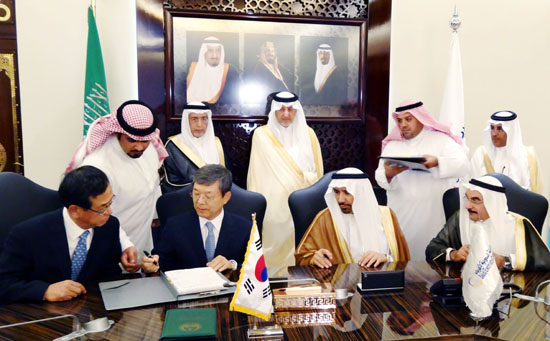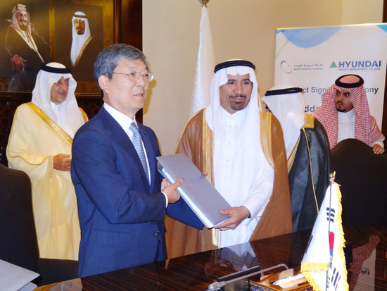 현대중공업은 지난 15일 사우디아라비아 제다(Jeddah)시에서 이재성 사장과 칼리드 알파이잘(Khaled Al-Faisal) 사우디 왕자, 압두르 라흐만 알호세인(Abdur Rahman Al-Hossein) 수전력청 장관, 살레 후세인 알라와지(Saleh Hussein Alawaji) SEC 이사회 회장 등이 참석한 가운데, ‘제다 사우스 화력발전소(Jeddah South Thermal Power Plant)’ 계약식을 가졌다고 밝혔다.(사진:현대중공업 이재성 사장과 SEC 살레 후세인 알라와지 이사회 회장이 함께 계약서를 들어 보이고 있다.)