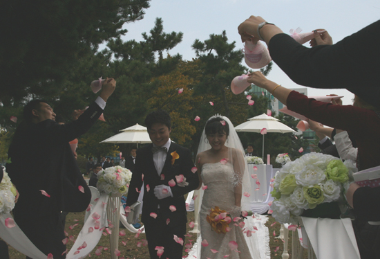 20일 인천항 내항 갑문 조경지구에서 백년가약을 맺은 신랑 한광섭 군, 신부 서아름 양이 즐거운 표정으로 함께 행진하고 있다.